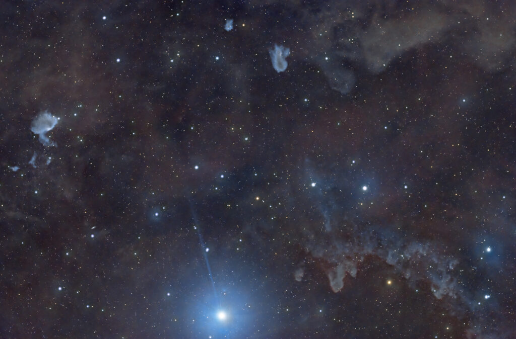 Der Hexenkopfnebel (auch bekannt als IC 2118) ist ein reflektierender Nebel, der etwa 1.000 Lichtjahre von der Erde entfernt im Sternbild Eridanus liegt. Sein Name leitet sich von seiner charakteristischen Form ab, die an das Profil eines Hexenkopfes erinnert. Der Nebel reflektiert vor allem das Licht des nahegelegenen, hellen Sterns Rigel im Sternbild Orion. Die bläuliche Färbung entsteht durch das Streuen von Licht an feinen Staubpartikeln, wobei blaues Licht stärker gestreut wird als rotes. Der Hexenkopfnebel ist ein beliebtes Motiv in der Astronomie und Astrofotografie aufgrund seiner markanten Erscheinung und faszinierenden Struktur.