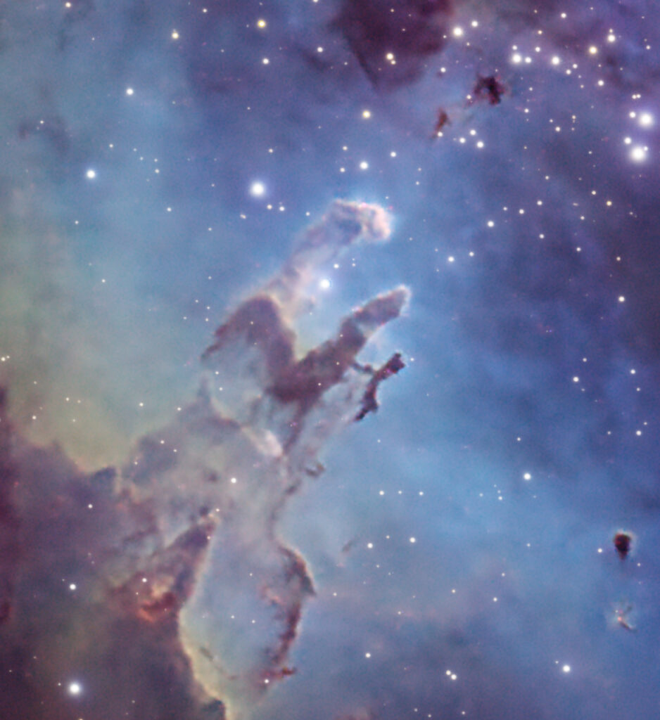 Majestätisch ragen die Säulen der Schöpfung im Adlernebel in die Dunkelheit des Alls. Dieses Astrofoto offenbart die dichten Wolken aus Gas und Staub, in denen neue Sterne geboren werden – ein faszinierender Blick auf die Wiege des Universums.