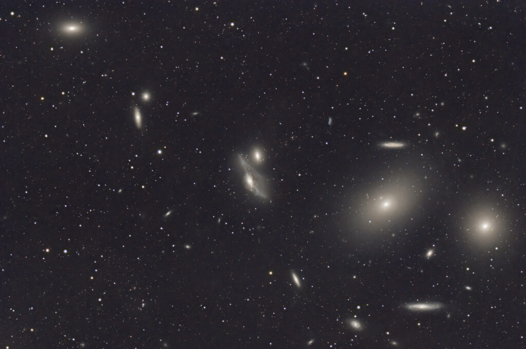 Dieses atemberaubende Astrofoto zeigt die Markajansche Kette – eine faszinierende Reihe von Galaxien, die durch ihre filigranen Spiralarme und leuchtenden Kernregionen besticht. Die Aufnahme offenbart die komplexe Struktur und die dynamischen Wechselwirkungen der Galaxien untereinander, ein eindrucksvolles Zeugnis der Schönheit und Vielfalt des Universums.