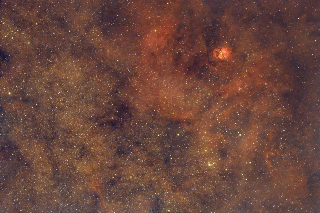 Dieses Astrofoto zeigt die M20, besser bekannt als den Trifidnebel, ein faszinierendes Sternentstehungsgebiet im Sternbild Schütze. Charakteristisch sind die dunklen Staubbahnen, die den Nebel in drei markante Bereiche teilen und ihm seinen Namen verleihen. Rötlich leuchtender Emissionsnebel, bläuliche Reflexionsnebel und dunkle Staubwolken treffen hier auf engem Raum zusammen. In seinem Inneren formen junge, heiße Sterne aus Gas und Staub neue Sonnen – ein eindrucksvoller Blick in eine kosmische Kinderstube.