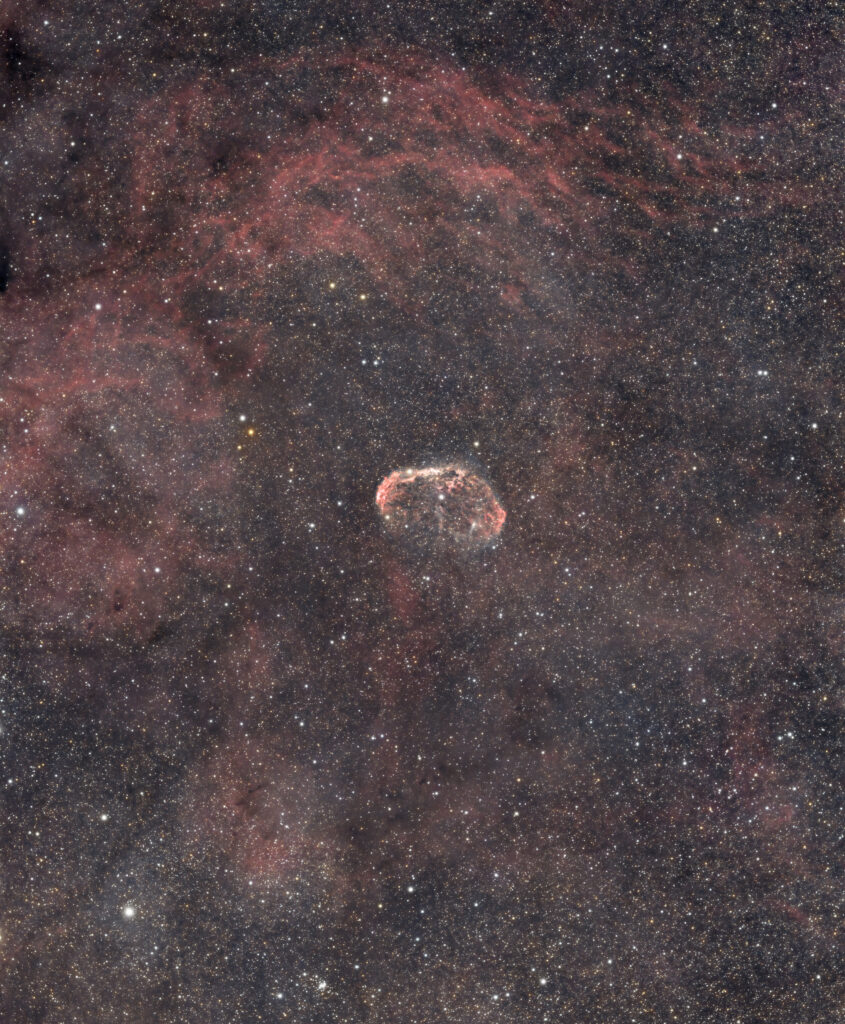 NGC 6888, der Crescent-Nebel, leuchtet hier als kosmische Blase aus Gas und Staub im Sternbild Schwan. Entstanden ist diese filigrane Struktur durch die heftigen Sternwinde eines massereichen Wolf-Rayet-Sterns, der sein Umfeld seit Jahrtausenden formt. In der Umgebung zeichnen sich feine Emissionsnebel und dichte Dunkelwolken ab – stille Zeugen eines dynamischen Wechselspiels zwischen Sternentstehung und -zerstörung. Das Bild offenbart eindrucksvoll, wie energiereich und zugleich zerbrechlich die Prozesse im interstellaren Raum sind.